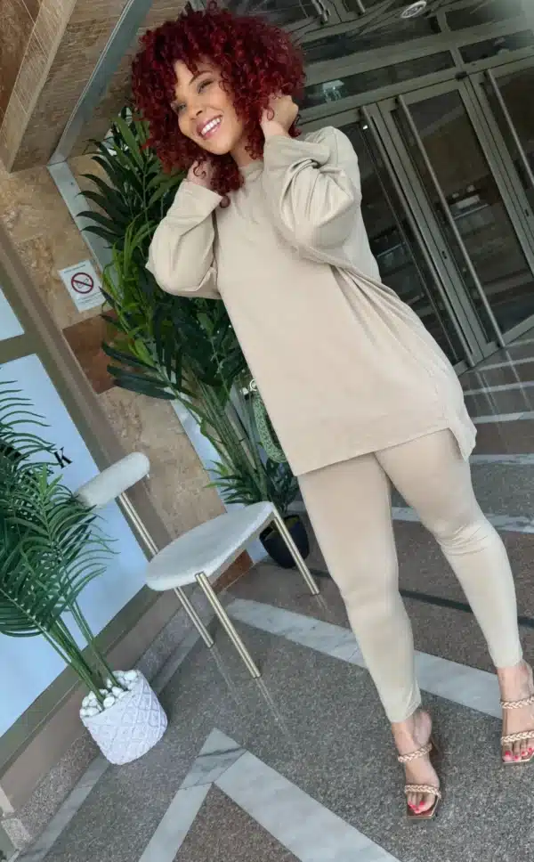 Cet ensemble associe un legging ajusté à une tunique oversize, créant une silhouette équilibrée et moderne. La tunique, avec sa coupe ample et confortable, est idéale pour celles qui recherchent un vêtement qui s’adapte à toutes les morphologies. Le legging, quant à lui, offre un maintien parfait et un confort optimal grâce à sa matière extensible.